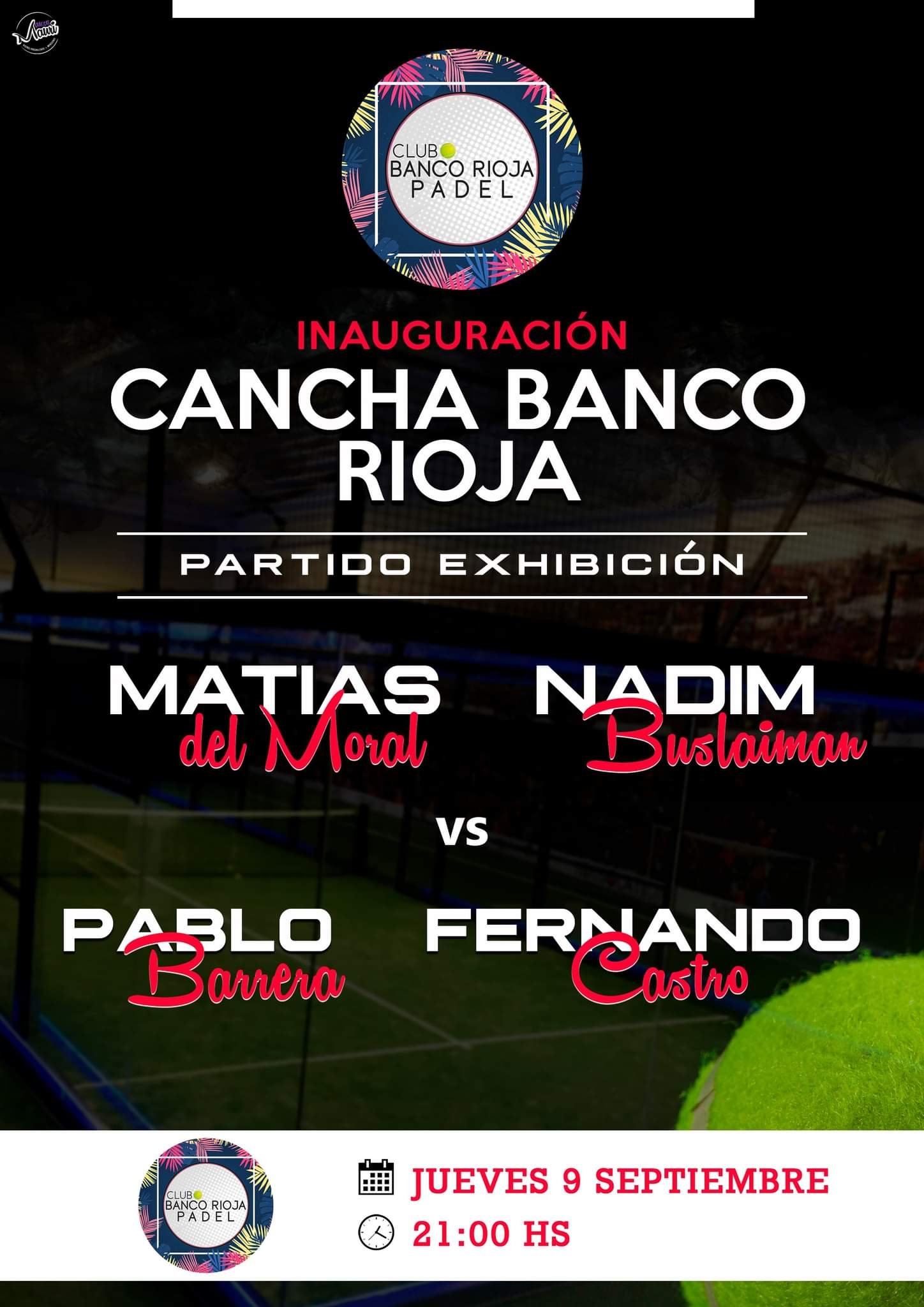 El proximo jueves 9 de Septiembre se llevarà a cabo la inauguracion de las nuevas canchas del Club Banco Rioja.