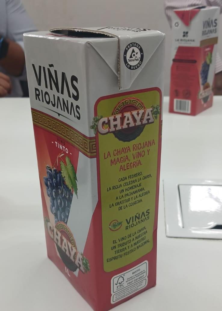 El gerente de La Riojana Cooperativa, Matías Caimi, le presentó al ministro de Turismo y Culturas, Gustavo Luna, el flamante packaging de su tradicional vino “Viñas Riojanas”, que en sus versiones blanco y tinto en envase tetrabrik contiene el logo oficial del Festival de la Chaya, además de un texto que resalta el valor cultural de la Chaya como evento que identifica a La Rioja ante el país y el mundo.