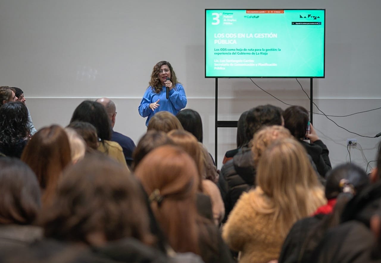 Durante la mañana del viernes 16, la secretaria de Comunicación y Planificación Pública del Gobierno de La Rioja, Luz Santángelo Carrizo, participó de la tercera jornada del 3° Congreso Federal de Empleo Público en el Paseo Cultural Castro Barros, con la mesa de ponencia “Los ODS como hoja de ruta para la gestión: la experiencia del Gobierno de La Rioja”.