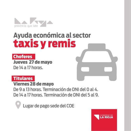 A PARTIR DE HOY A LAS 14 HS COMIENZA EL PAGO DE AYUDA ECONÓMICA A TAXIS Y REMISES Federico conteras 27 mayo, 2021 Hoy Jueves 27 de mayo cobran de 14 a 17 hs CHOFERES Viernes 28 TITULARES • 9 a 13 hs terminacion del DNI 0 al 4 • 14 a 17 hs terminacion del DNI 5 al 9 LUGAR DE PAGO: SEDE DEL COE COMPARTIR & PUBLICAR