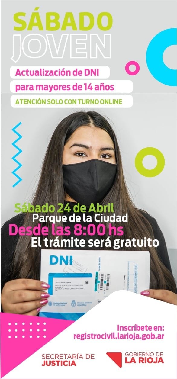 Este sábado 24 de abril, el Registro Civil de la Provincia de La Rioja, dependiente de la Secretaría de Justicia, atenderá a los y las jóvenes en el Parque de la Ciudad en el horario de 8:00 a 18:00 horas, previa inscripción a través de la Página Web: registrocivil.larioja.gob.ar. En razón de la demanda, también se atenderá el domingo 25 en los mismos horarios.