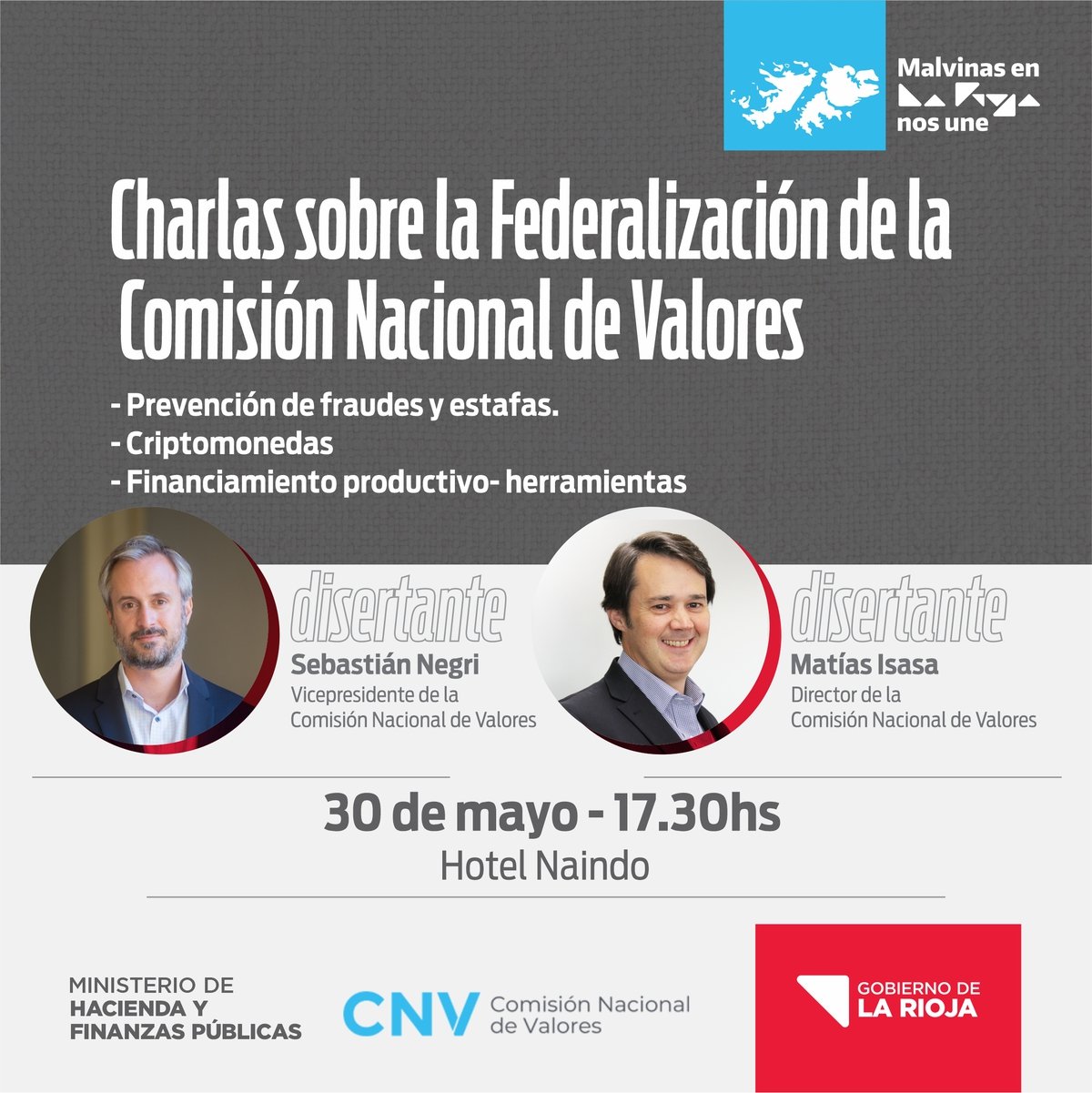 El próximo lunes 30 de mayo, se llevarán a cabo las “Charlas sobre la Federalización de la Comisión Nacional de Valores” auspiciadas por el Ministerio de Hacienda y Finanzas Públicas y estarán a cargo de Sebastián Negri, vicepresidente de la Comisión Nacional de Valores y Matías Asisi director de la institución. El evento tendrá lugar en el Hotel Naindo a partir de las 17 30 horas.