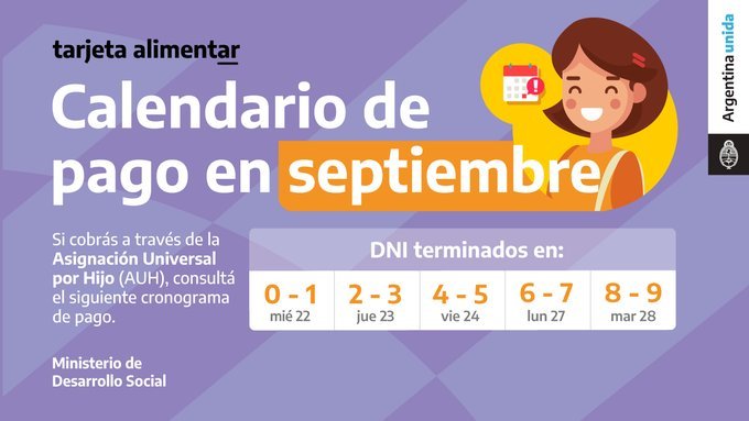 Para quienes cobren por medio de la AUH, el cronograma de acreditación comienza el miércoles 22 de septiembre.