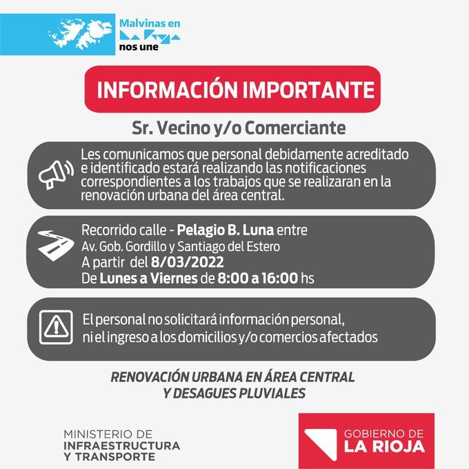 “Les comunicamos que personal debidamente acreditado e identificado, estará realizando las notificaciones correspondientes a los trabajos que se realizaran en la renovación urbana del área central.