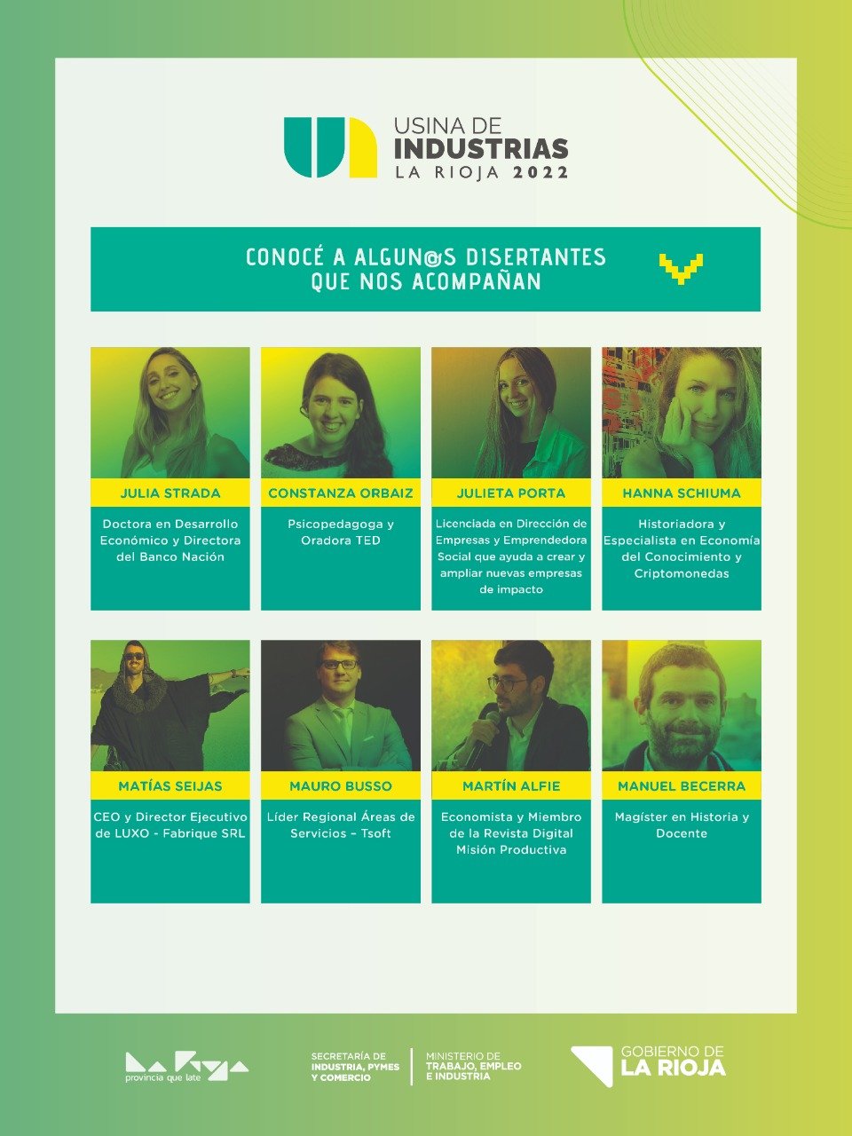 “Usina de Industrias” – el primer evento local que tiene como objetivo promocionar las industrias riojanas y los saberes alrededor de las mismas -contará con la participación de más de 20 especialistas, divulgadores y periodistas nacionales y locales que brindarán charlas, talleres y conversatorios. Además, para generar oportunidades de negocio, se impulsaran espacios de vinculación entre las pymes, empresas, estudiantes y público en general.