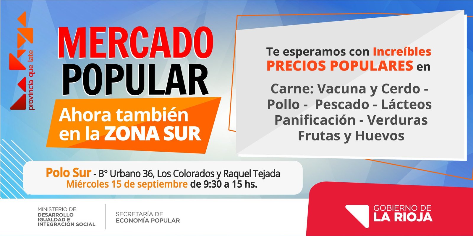 El Ministerio de Desarrollo, Igualdad e Integración Social informa que será desde las 9.30 a 15 horas, el Mercado Polo Sur, y abarcará barrio Urbano 36, Los Colorados y Raquel Tejada.