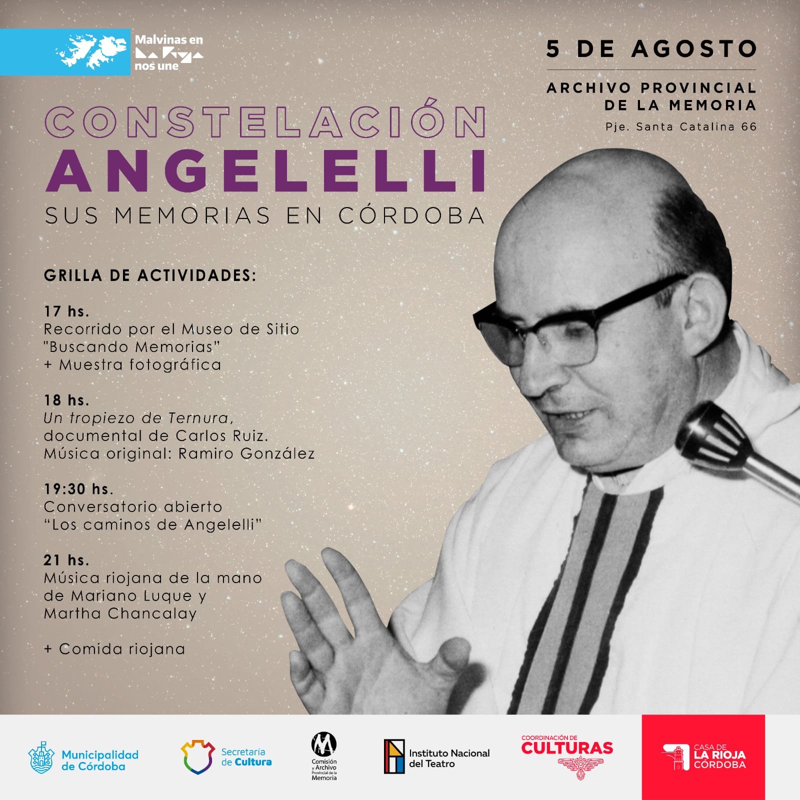 En una nueva acción conjunta entre las representaciones de Córdoba y La Rioja del Instituto Nacional del Teatro, la Casa de La Rioja en Córdoba y con el apoyo de la Secretaria de cultura de la municipalidad de Córdoba y el Archivo Provincial de la Memoria, se realizarán actividades en conmemoración de Enrique Angelelli.