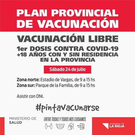 El Gobierno Provincial anunció que este sábado 24 de julio se pondrá nuevamente en funcionamiento los Vacunatorios Libres para +18 años que por determinadas razones no lograron vacunarse la semana pasada.