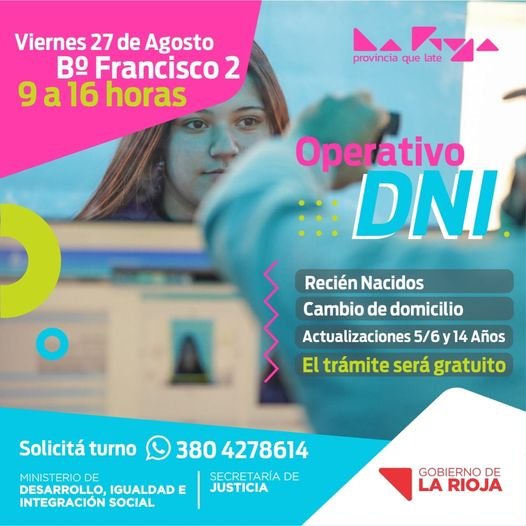 El Gobierno de La Rioja, a través del Ministerio de Desarrollo, Igualdad e Integración Social y la Secretaría de Justicia, realizará el próximo 27 de agosto el Operativo DNI para que los riojanos y las riojanas puedan realizar el trámite de documento de manera gratuita de 9 a 16 hs.