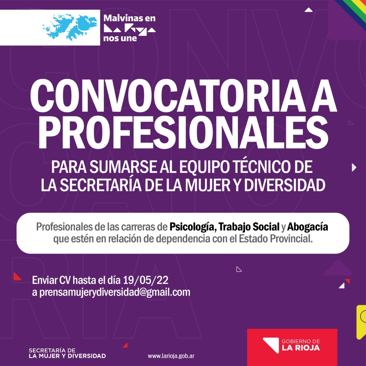 La Secretaría de la Mujer y Diversidad convoca a profesionales de las carreras de Psicología, Trabajo Social y Abogacía, que estén en relación de dependencia con el Estado Provincial, para prestar servicios en las inmediaciones de esta Secretaría y sus respectivos dispositivos. Las personas interesadas deberán enviar currículum vitae desde hoy, Miércoles 11/05/22 hasta el día Jueves 19/05/22 al e-mail: prensamujerydiversidad@gmail.com.