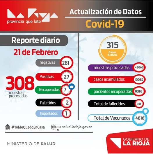 ESTE DOMINGO, SE PROCESARON 308 MUESTRAS, DE LAS CUALES 281 SON NEGATIVAS Y 27 POSITIVAS PARA COVID-19, DE LOS CUALES UNO ES IMPORTADO DE LA PROVINCIA DE CÓRDOBA. SE TRATA DE 15 MUJERES Y 12 HOMBRES.