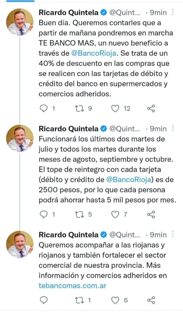 EL GOBERNADOR QUINTELA HIZO UN IMPORTANTE ANUNCIO EN SUS REDES SOCIALES CON NUEVO BENEFICIO PARA TODAS Y TODOS LOS RIOJANOS: “TE BANCO MAS”