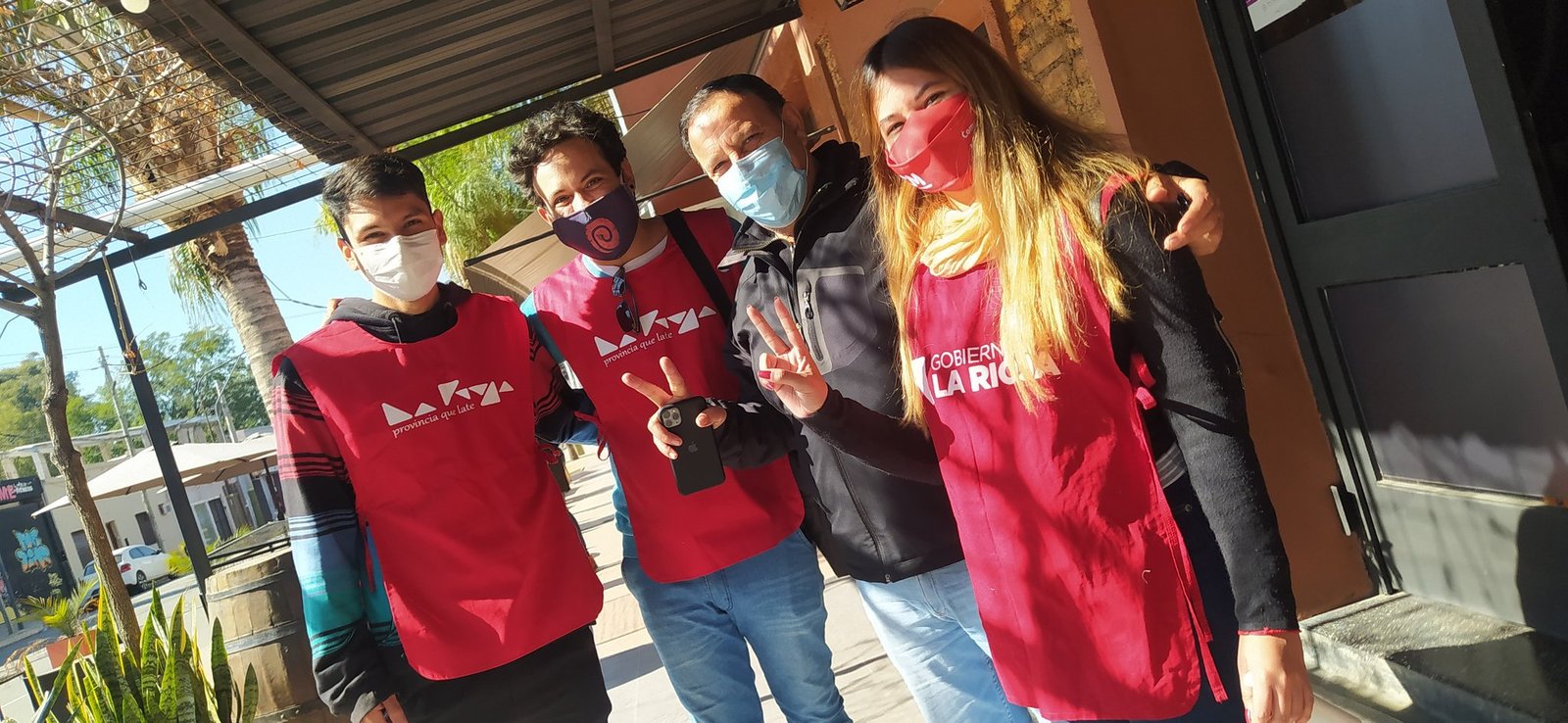 Durante el recorrido esta joven junto a sus dos compañeros se encuentran al Gobernador de la Provincia, Ricardo Quintela y al Secretario General de la Gobernacion, Armando Molina, caminando y acompañando a los chalecos rojos que diariamente se encuentran cuidándonos.