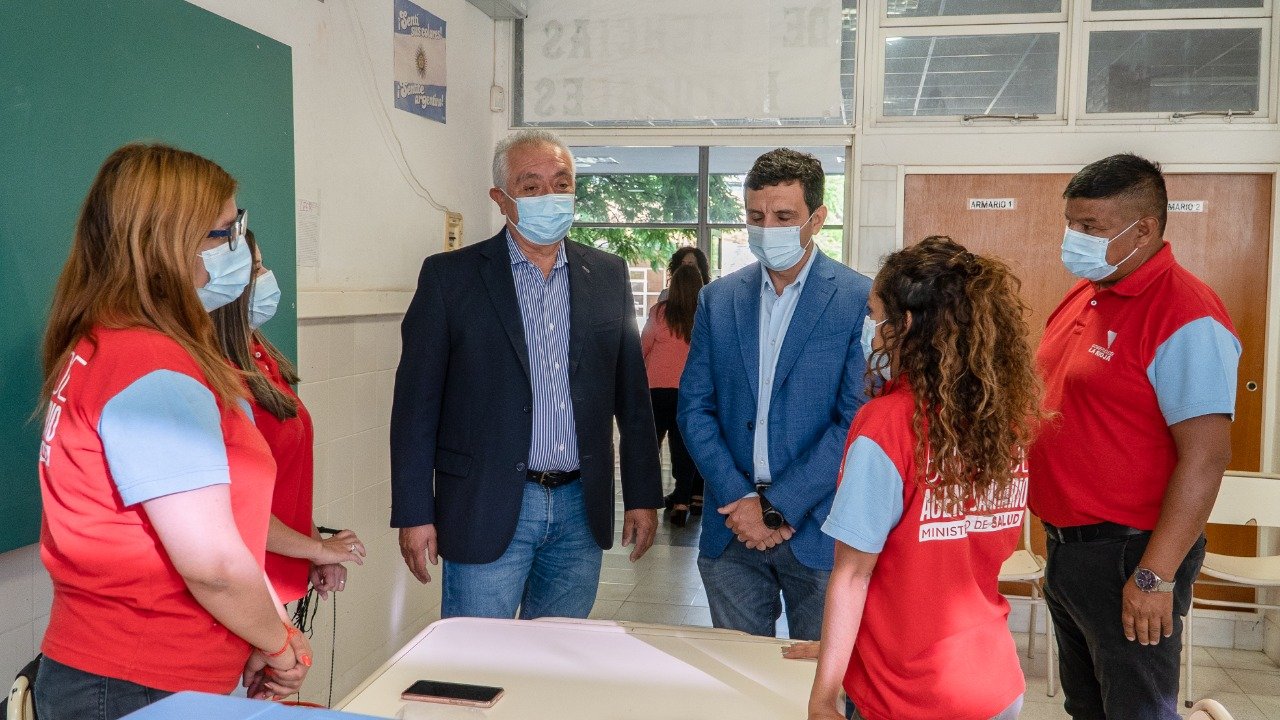 Los ministro de Educación, Ariel Martínez, y de Salud Juan Carlos Vergara, visitaron el colegio secundario de la escuela Normal para comenzar con la vacunación a docentes y no docentes que se encuentran en condiciones de recibir la dosis de refuerzo.