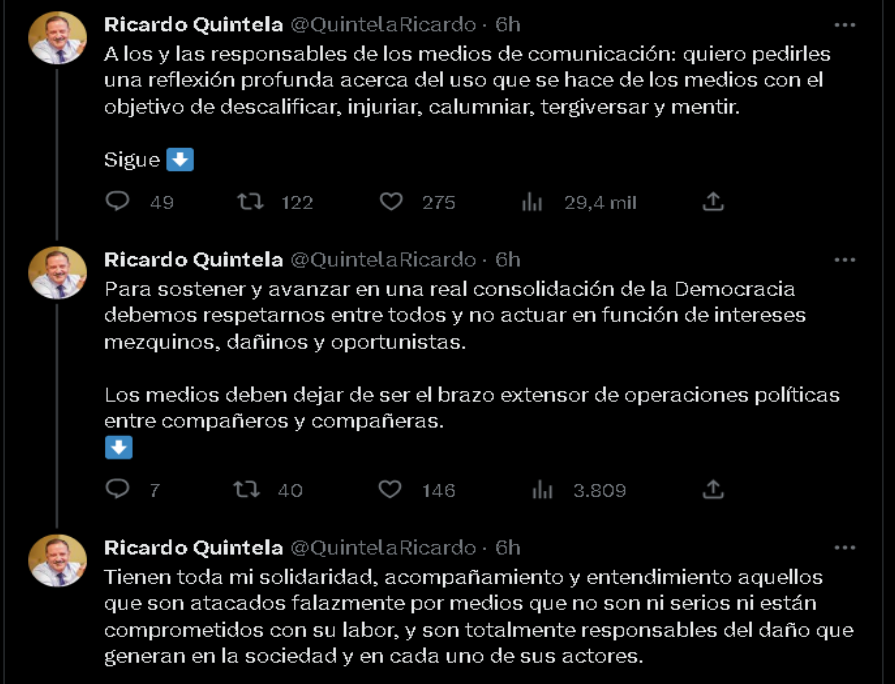 «Tienen toda mi solidaridad, acompañamiento y entendimiento aquellos que son atacados falazmente por medios que no son ni serios ni están comprometidos con su labor, y son totalmente responsables del daño que generan en la sociedad y en cada uno de sus actores», finalizó el mandatario riojano.