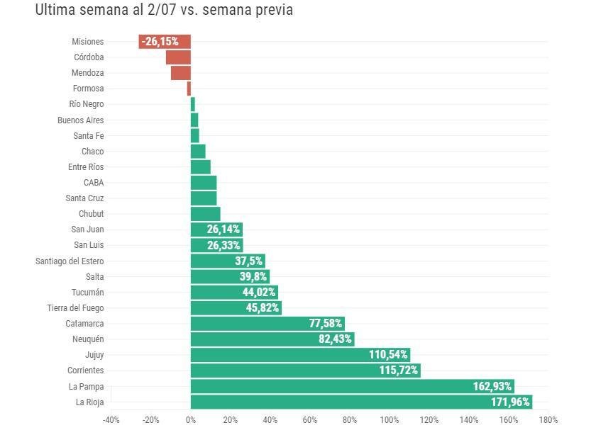 De acuerdo al registro de vacunación brindado por el Gobierno Nacional, el ritmo creció u 46% en todo el país, gracias principalmente a la llegada de nuevas dosis. Particularmente La Rioja (172%), junto a La Pampa (163%) y Corrientes (116%), fueron las provincias que más aceleraron el proceso de vacunación en la última semana.
