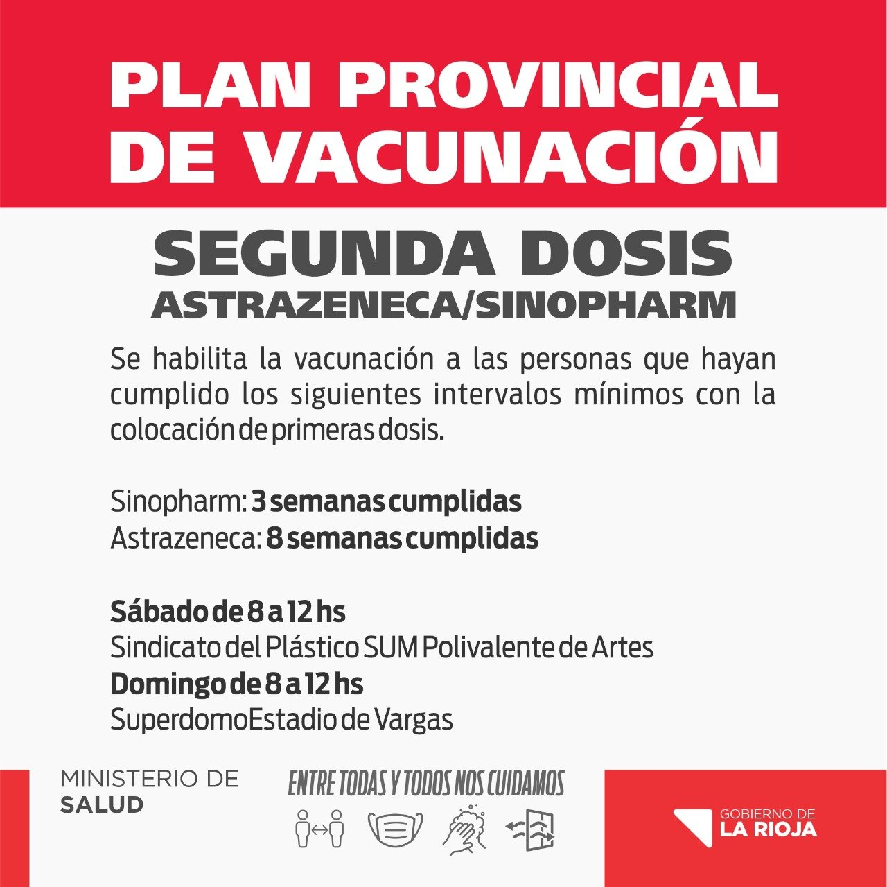 Desde el Ministerio de Salud de la provincia informaron este jueves sobre la habilitación de las segundas dosis de Sinopharm y Astrazeneca a aquellas personas que hayan cumplido los intervalos mínimos con la colocación de primeras dosis, Sinopharm 3 semanas cumplidas y Astrazeneca 8 semanas cumplidas.