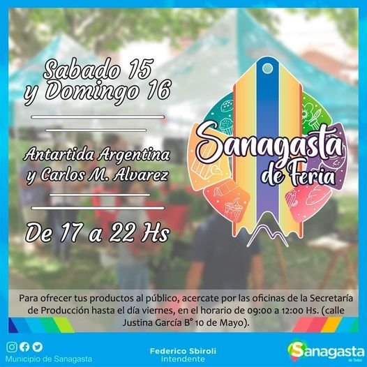 Este Sábado 15 y Domingo 16, te invitamos a disfrutar de esta nueva edición de Sanagasta de Feria, donde los emprendedores de nuestro pueblo estarán exponiendo sus diferentes artículos.