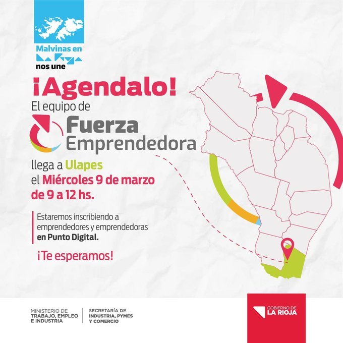 ESTE MIÉRCOLES “FUERZA EMPRENDEDORA” VIAJA A ULAPES Federico conteras 7 marzo, 2022 Emprendedores y emprendedoras de Ulapes nos vemos este Miércoles 09 de Marzo De 09 a 12 horas En el Punto Digital. Te informaremos sobre el programa #FuerzaEmprededora y ayudaremos en el registro de nuestro sitio. COMPARTIR & PUBLICAR