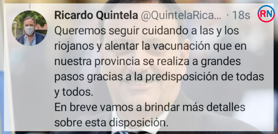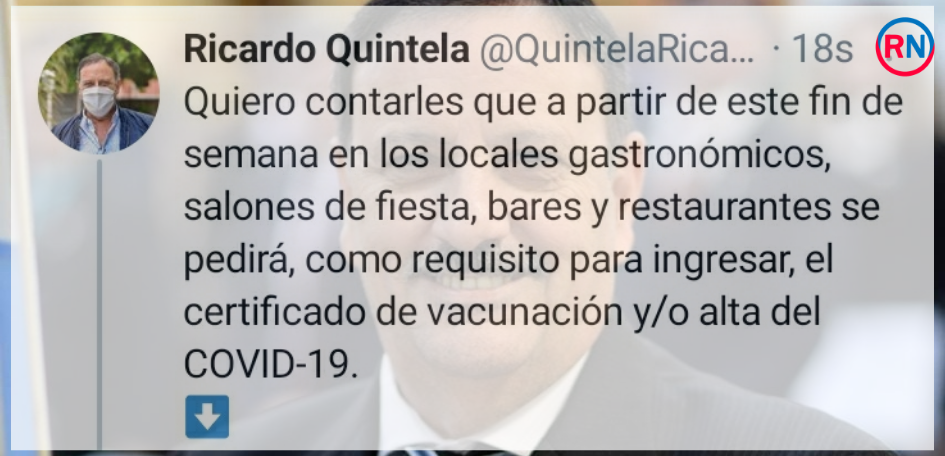 El mandatario provincial anunció en el día de ayer en sus cuentas oficiales que a partir de este fin de semana se pedirá certificado del alta Covid-19 o certificado de vacunación para poder ingresar a los bares, sectores gastronómicos, restaurantes y salones de eventos.