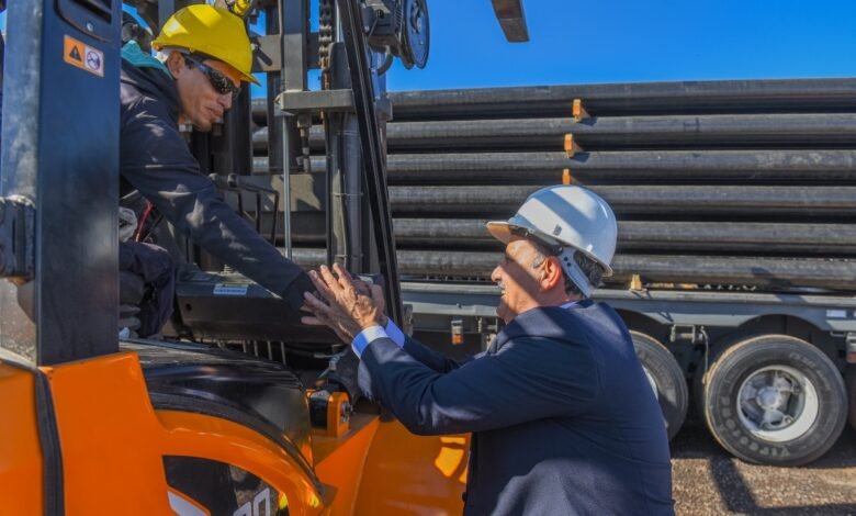 En cuanto a las cañerías, informó que son de 8 pulgadas y de 6 milímetros de espesor, de 12 metros de largo cada caño y que pesan unos 800 kilos cada uno. «Ya tenemos 16 kilómetros de cañería acopiados de los 130 que se necesitan», indicó.