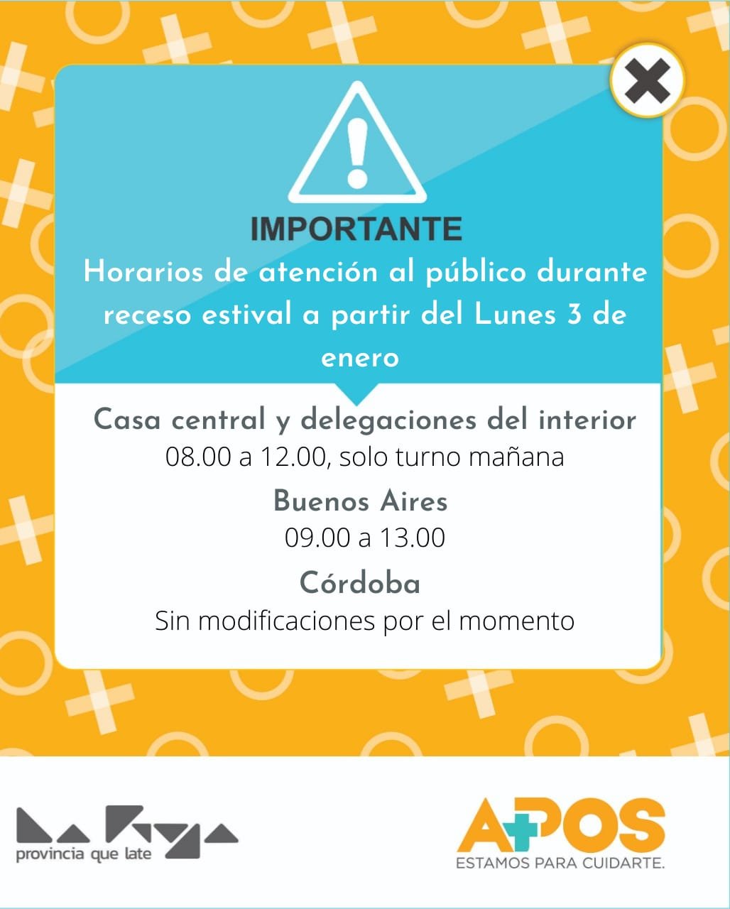 La Empresa APOS informa a toda la comunidad sus horarios de atención al público a partir de este lunes 03 de enero: