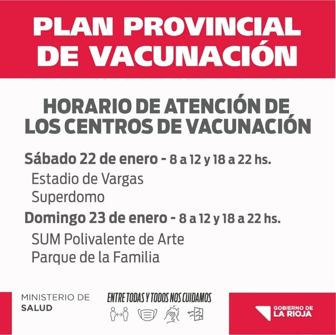 HORARIOS DE ATENCIÓN EN LOS CENTROS DE VACUNACIÓN PARA ESTE FIN DE SEMANA Federico conteras 21 enero, 2022 SABADO 22 DE ENERO Estadio de VargasSuperdomoPor la mañana de 8 A 12 hs.Por la tarde de 18 a 22 hs. DOMINGO 23 DE ENERO SUM Polivalente de ArteParque de la FamiliaPor la mañana de 8 a 12 hs.Por la tarde de 18 a 22 hs. COMPARTIR & PUBLICAR
