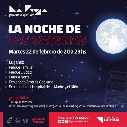 HOY MARTES: “LA NOCHE DE LAS VACUNAS” Federico conteras 22 febrero, 2022 Es muy importante que completes tu esquema de vacunación. ¡Hoy te esperamos en la Noche de las vacunas! Dirigite al centro más cercano. No te olvides del DNI y carnet de vacunación COMPARTIR & PUBLICAR