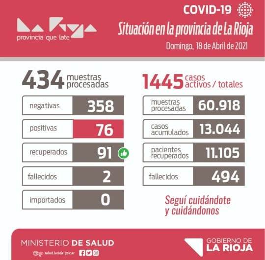 Este domingo se procesaron 434 muestras, de las cuales 358 son negativas y 76 positivas para COVID-19. Se trata de 35 mujeres y 41 hombres.
