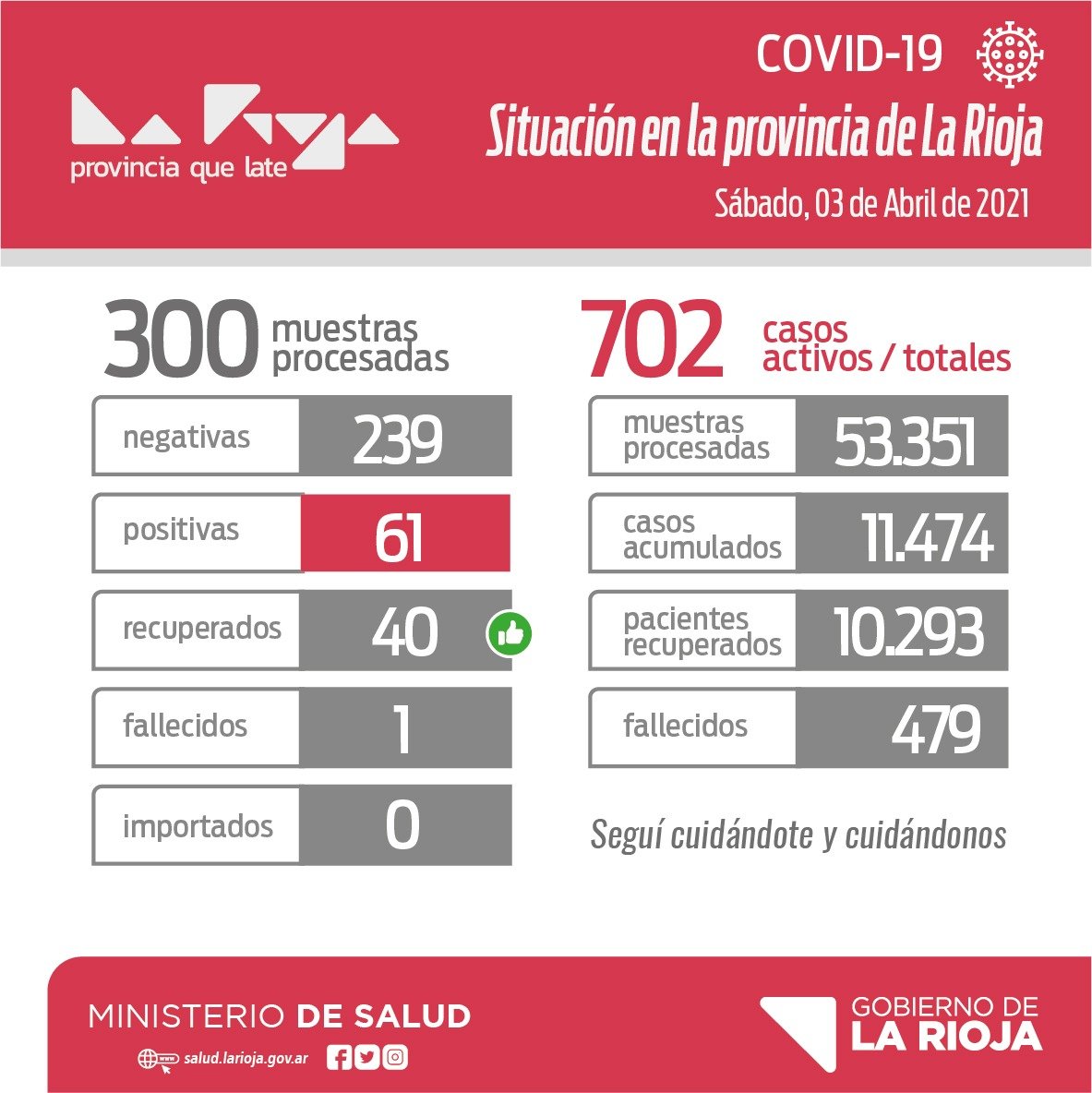 Se registraron 40 casos en Capital, 10 en Chilecito, 3 en Famatina, 3 en Ángel Vicente Peñaloza, 3 en San Martín, 1 en Vinchina y 1 en Arauco.