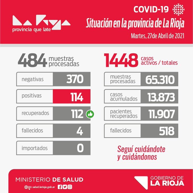 En estos momentos tenemos 13.877 casos acumulados, hoy se recuperaron 112 personas, haciendo un total de 11.907 recuperados, tenemos 1.448 casos activos y 518 fallecidos.