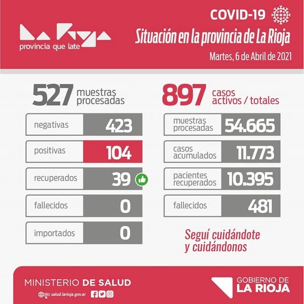 Este martes se procesaron 527 muestras, de las cuales 423 son negativas y 104 positivas para COVID-19. Se trata de 59 mujeres y 45 hombres.