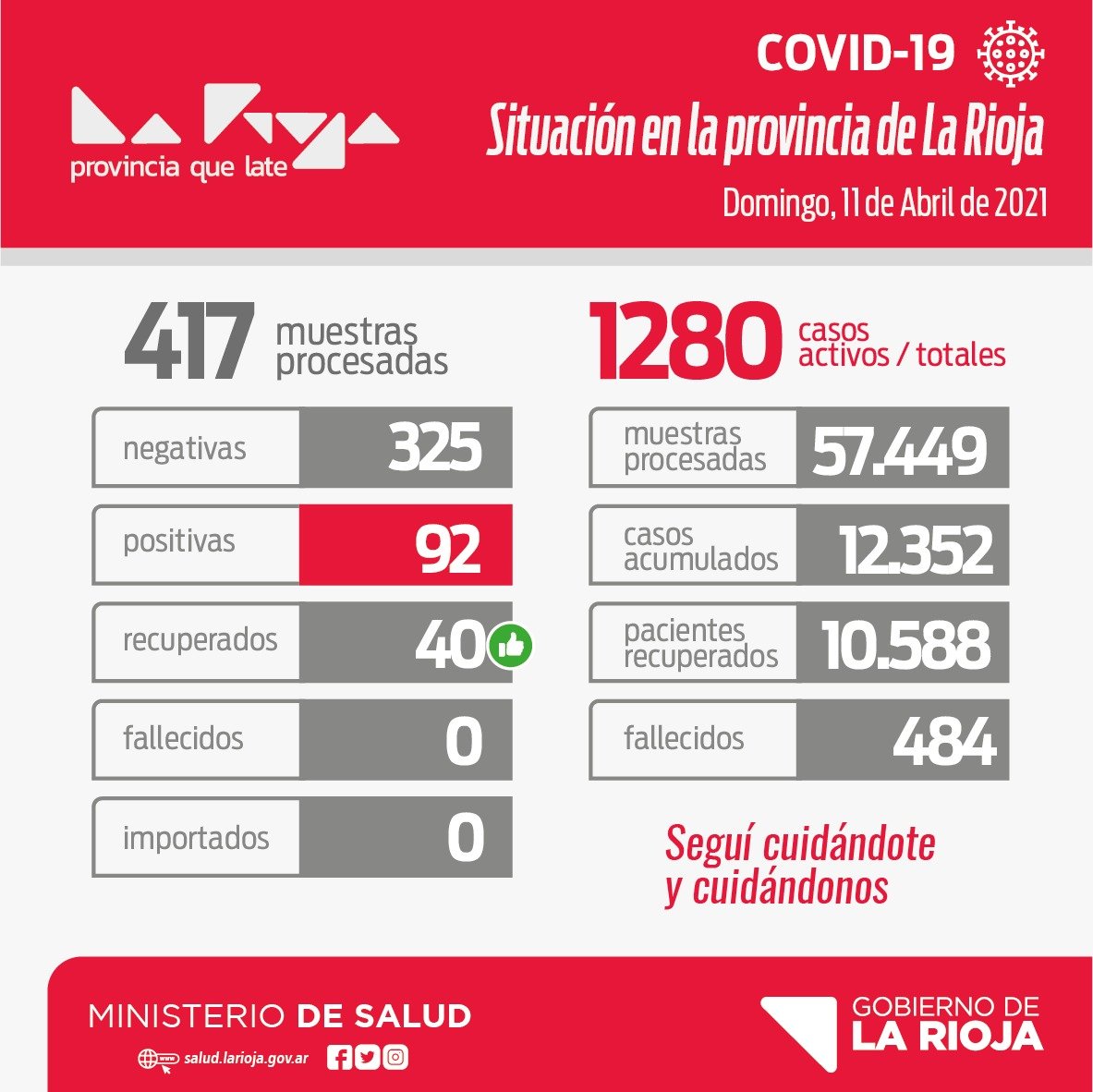 En estos momentos tenemos 12.352 casos acumulados, hoy se recuperaron 40 personas, haciendo un total de 10.588 recuperados, tenemos 1.280 casos activos y 484 fallecidos.
