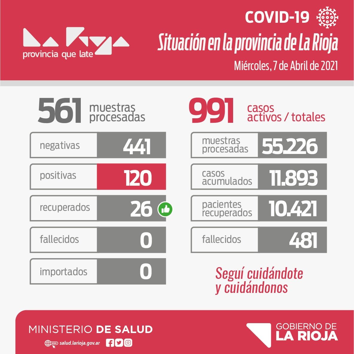 Este miércoles se procesaron 561 muestras, de las cuales 441 son negativas y 120 positivas para COVID-19. Se trata de 65 mujeres y 55 hombres.