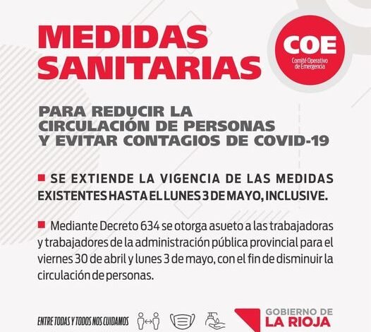 De igual manera, el Ejecutivo Provincial informó que mediante Decreto 635, también con fecha de hoy, se decidió prorrogar hasta el lunes 3 de mayo la vigencia del Decreto N° 540/04 que estableció la últimas medidas para prevenir la propagación del virus.