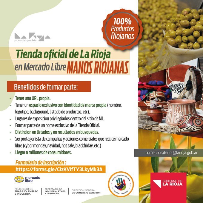El ministerio de Trabajo, Empleo e Industria, a través de la Secretaría de Industria, PyMEs y Comercio y la Dirección de Comercio Exterior, convoca a emprendedores/as riojanos/as a sumarse a la tienda oficial “Manos Riojanas” en Mercado Libre, para llegar y ofrecer productos artesanales y regionales a todos los rincones del país.