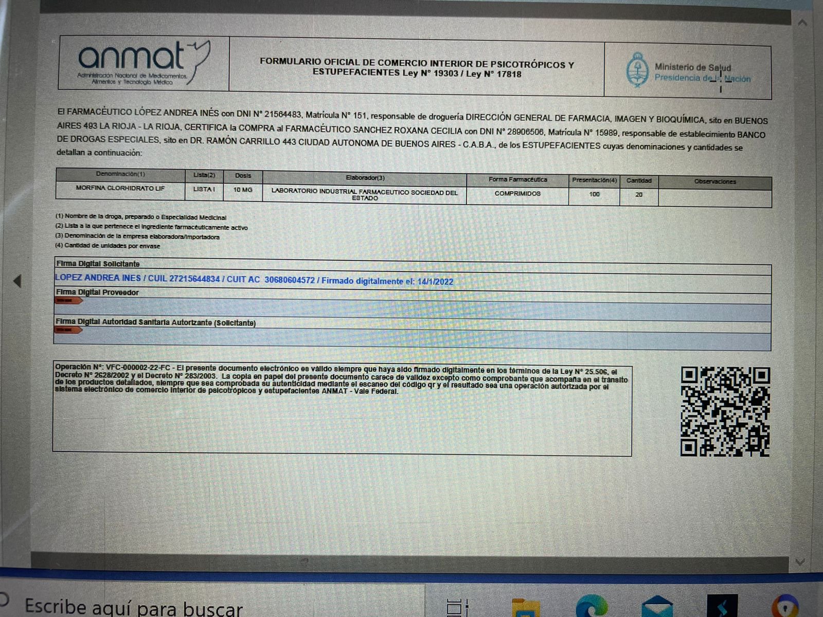 Desde la Dirección de Farmacia con la autorización de la Dirección de Fiscalización y Regulación Sanitaria, se hizo una operación para solicitar la provisión de morfina comprimidos al Banco Nacional de Drogas Especiales (BNDE) de Nación utilizando por primera vez el Vale Federal, una herramienta que utiliza Firma Digital y que agilizará de manera sustancial los trámites legales de las operaciones de comercio interior de psicotrópicos y estupefacientes.