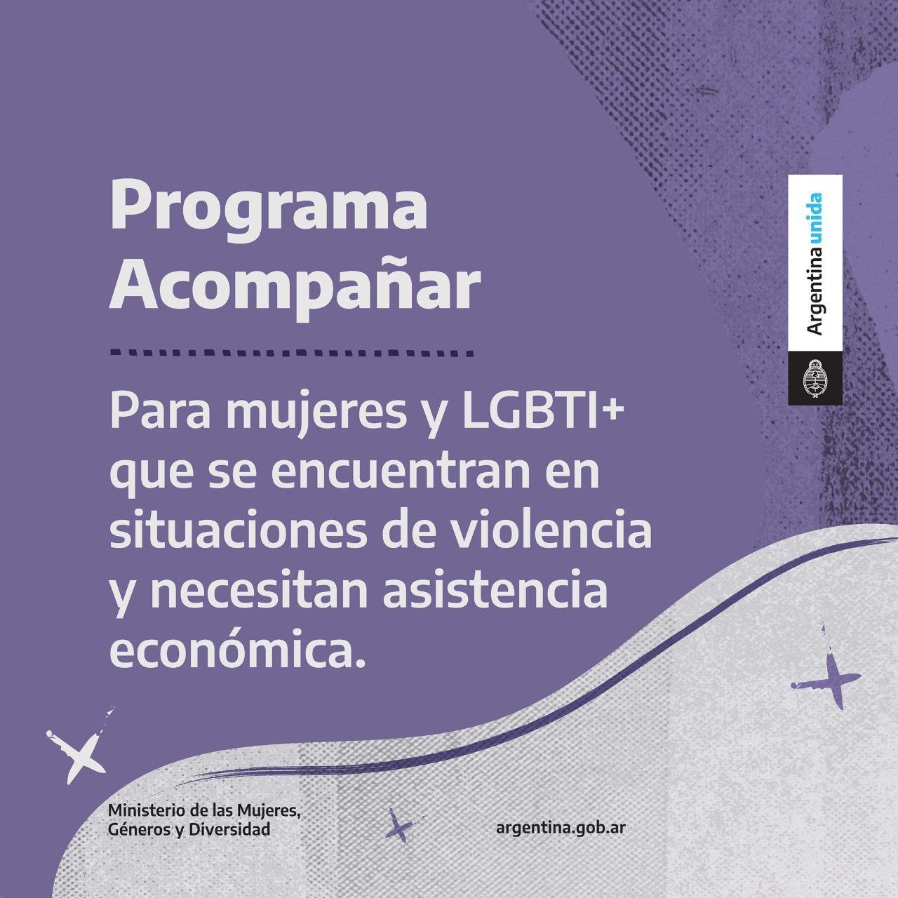 La Secretaría de la Mujer y Diversidad, iniciará este lunes, las inscripciones para el programa nacional Acompañar. Se trata del programa del Ministerio de las Mujeres, Género y Diversidad que consiste en acompañamiento psico-social y económico, equivalente al salario mínimo, vital y móvil durante un período de 6 meses, para mujeres y LGBTI+ en situación de violencia de género.