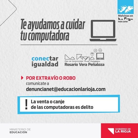 Desde el Ministerio de Educación de la provincia, se realizo un comunicado a toda la comunidad sobre la venta o canje de computadoras, notificando que el mismo es un delito, razón por la cual informaron que estarán recibiendo denuncias por extravío, robo o si se encuentren en venta ya sea por redes sociales o de manera física, de las computadoras correspondientes al Programa Conectar Igualdad y al Programa Rosario Vera Peñaloza, en el siguiente email: denuncianet@educacionlarioja.com