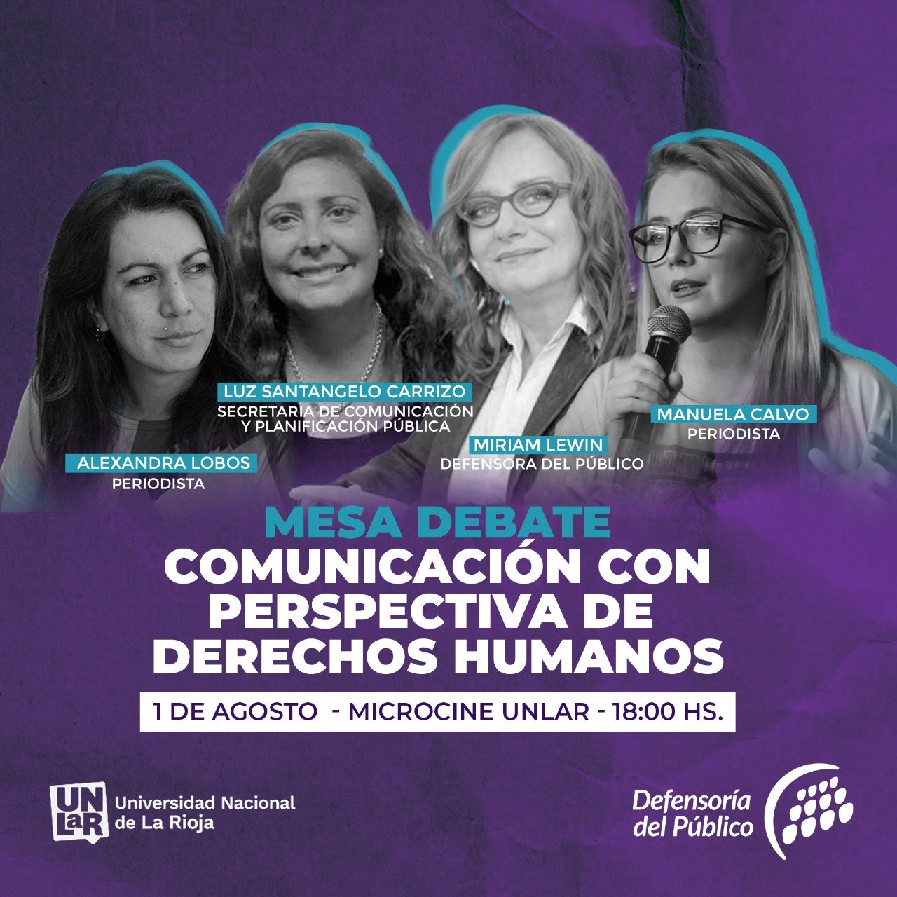 En su visita por La Rioja, la Defensora del Público junto a la Lic. Luz Santangelo Carrizo, la periodista activista Alexandra Lobos, y la Lic. Manuela Calvo incitaran al debate entre comunicadores locales, estudiantes y público interesado sobre la necesidad de comunicar con enfoque de Derechos Humanos. Los medios de comunicación desempeñan un papel fundamental en la configuración e interpretación de la realidad que nos rodea. Una realidad incompleta y parcial si no refleja los derechos y libertades de sus protagonistas.