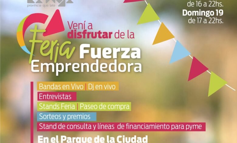 El Gobierno de la Provincia llevará a cabo este sábado 18 y domingo 19 de septiembre, por la tarde, la feria “Fuerza Emprendedora” en el Parque de la Ciudad. Durante las dos jornadas se podrá disfrutar, en familia o con amigos, de música en vivo, sorteos, entrevistas, stands de compras y exposiciones de arte.