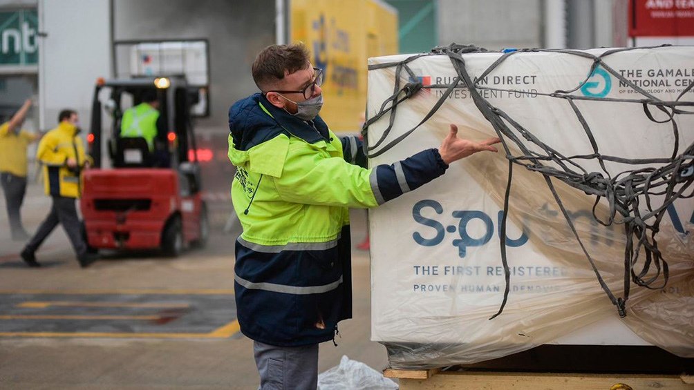 Las vacunas llegaron en el vuelo AR1065, de Aerolíneas Argentinas, que aterrizó en el aeropuerto internacional de Ezeiza a las 16,02 procedente de Moscú.