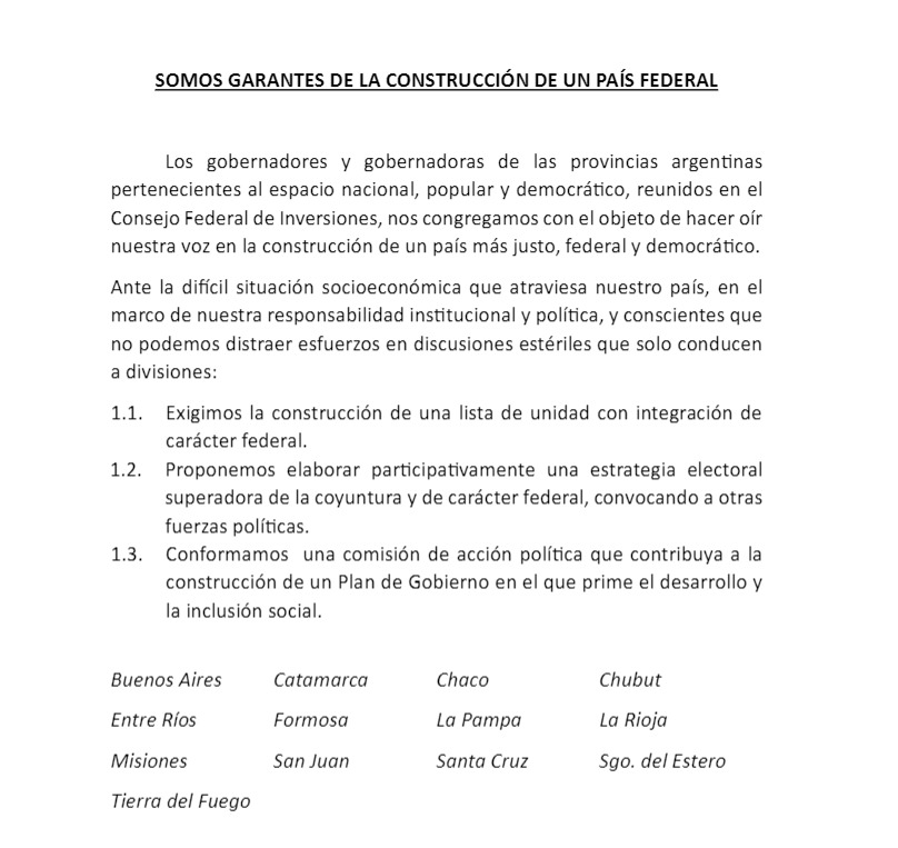 El comunicado está firmado por los gobernadores de Buenos Aires, Catamarca, Chaco, Chubut, Entre Ríos, Formosa, La Pampa, La Rioja, Misiones, San Juan, Santa Cruz, Santiago del Estero y Tierra del Fuego.