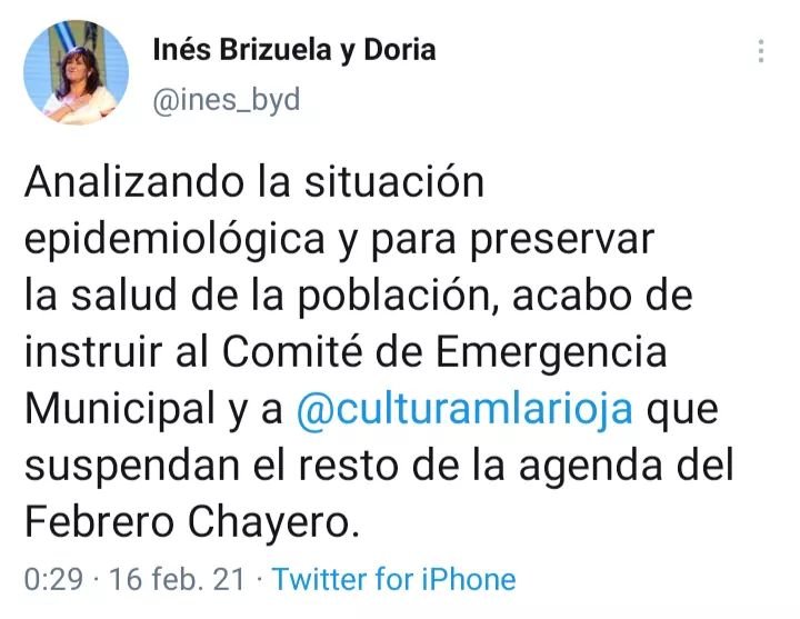LUEGO DEL BOCHORNOSO E IMPRUDENTE EVENTO, SUSPENDEN OFICIALMENTE EL ESPECTÁCULO «FEBRERO CHAYERO»: El mensaje de la Intendenta Inés Brizuela y Doria Federico conteras 16 febrero, 2021 COMPARTIR & PUBLICAR