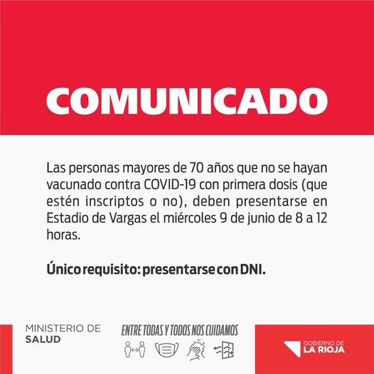 En el marco del Plan Operativo de Vacunación contra el Covid-19, desde el Ministerio de Salud de la Provincia informaron que las personas mayores de 70 años que no se hayan vacunado contra el coronavirus con primera dosis (que estén inscriptos o no), deben presentarse hoy miércoles de 8 a 12 en el Estadio de Vargas.