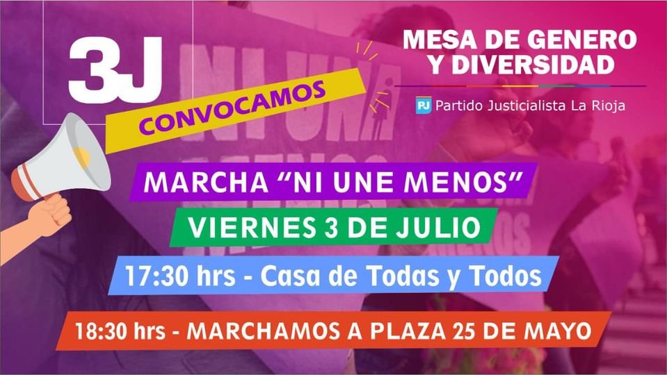 El viernes 3 de junio, a las 17.30 horas, nos concentramos en Casa de Todas y Todos (Av. Perón 532). Luego, a las 18.30 horas emprenderemos camino para unirnos a la marcha principal en Plaza 25 de mayo organizada por la Asamblea de “Ni una Menos”.
