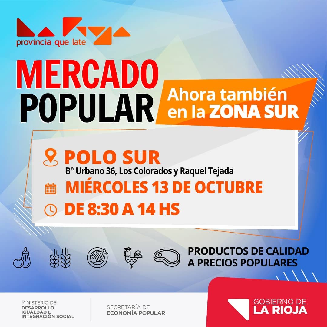 ¡¡MIÉRCOLES 13/10 MERCADO POPULAR – POLO SUR CON LOS MEJORES PRECIOS!! Federico conteras 12 octubre, 2021 Mañana miércoles 13/10 te esperamos en el Mercado Popular – Polo Sur, desde las 8:30 hasta las 14, para que aproveches productos a precios populares. Lugar: Bº Urbano 36, Los Colorados y Raquel Tejada. COMPARTIR & PUBLICAR