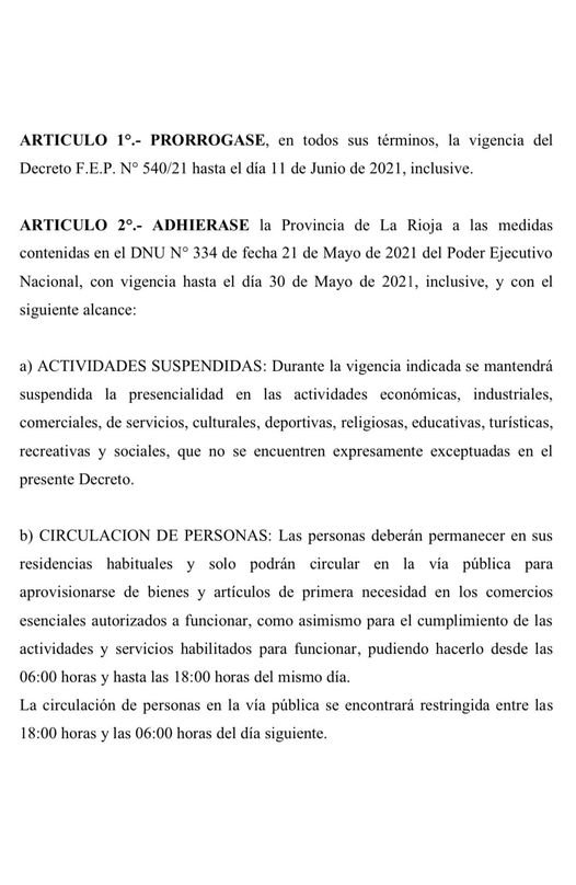 Al mismo tiempo por el mismo Decreto provincial se prorrogan hasta el 11/06 las medidas que venían rigiendo en la provincia hasta el día 21/05.