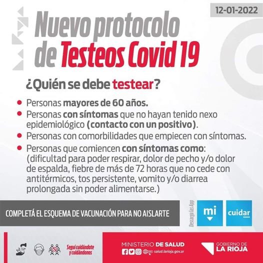 ¿QUIEN SE DEBE TESTEAR? NUEVO PROTOCOLO DE TESTEOS COVID 19 Federico conteras 13 enero, 2022 Personas mayores de 60 años Personas con síntomas sin nexo epidemiologico Personas con comorbilidades con sintomas Personas con sintomas, por ejemplo tener fiebre mas de 72 horas COMPARTIR & PUBLICAR