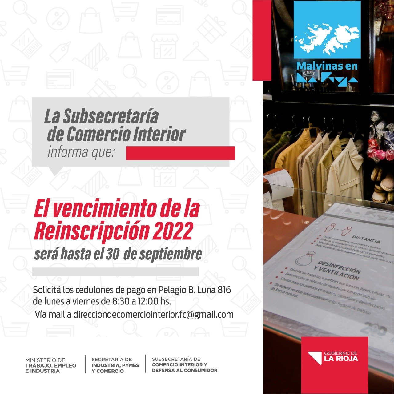 Para la reinscripción el contribuyente debe hacer el pedido del cedulón de pago enviando un e-mail a direcciondecomerciointerior.fc@gmail.com o de manera presencial en las oficinas de la Subsecretaría de Comercio Interior, ubicadas en calle Pelagio B. Luna N° 816, de lunes a viernes de 8.30 a 12.